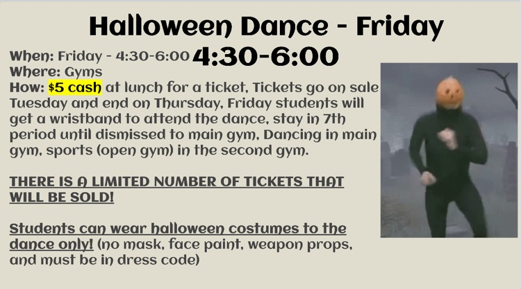 Reminder: Costumes are for the dance ONLY! During school hours, stick to dress code and keep it classy.