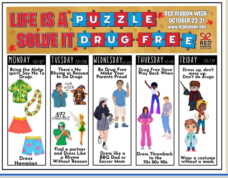 Red Ribbon Week is here! 🎉 Let’s show our spirit and stand strong against drugs by dressing up each day!
