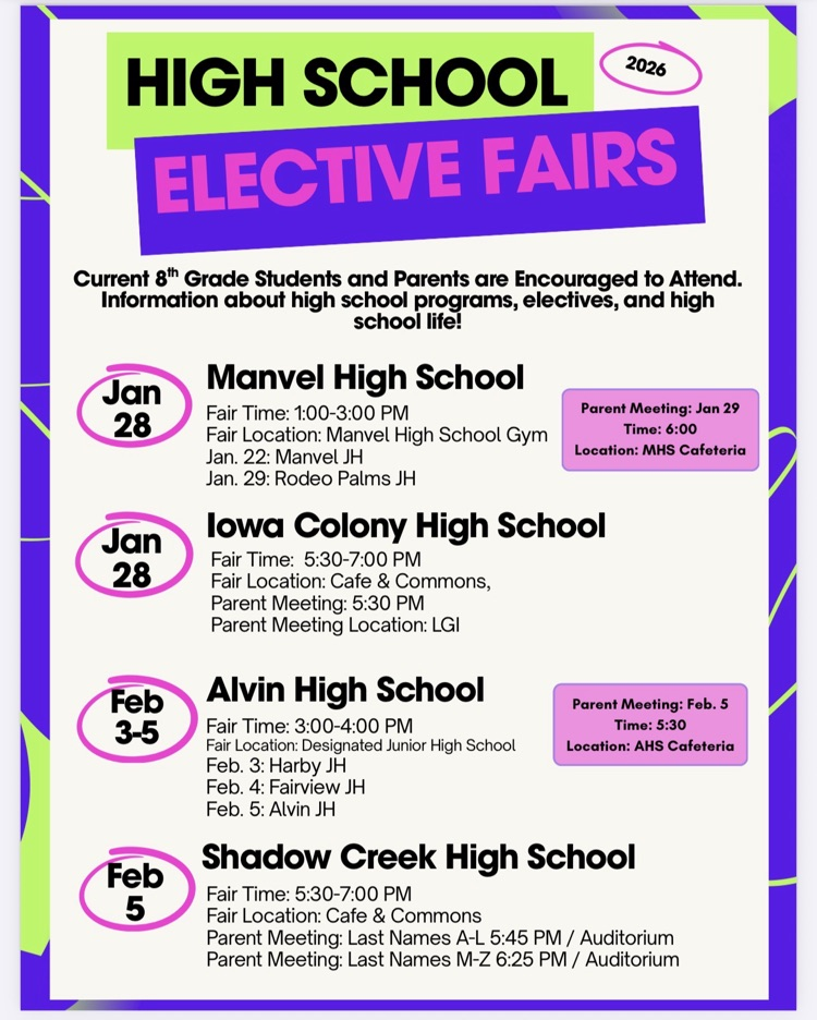 Our High School Elective Fair is open to all 8th graders! Come explore classes and discover new interests as you get ready for high school. Your next chapter starts now!